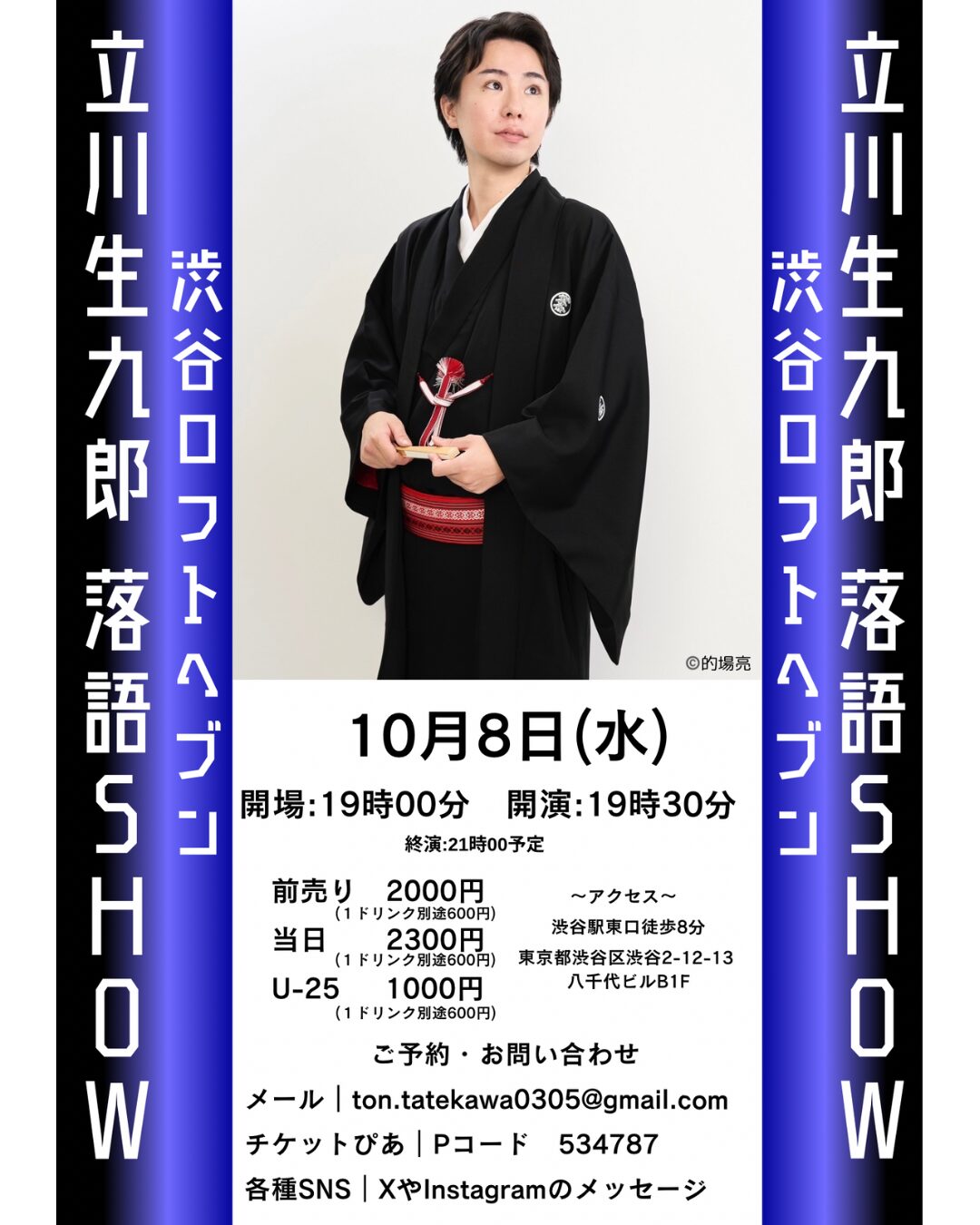 SCHEDULE 2025 10 08 Wednesday 立川生九郎落語SHOW OPEN 19:00 - START 19:30 Tweet 【出演】 立川生九郎 TICKET https://t.pia.jp/pia/event/event.do?eventCd=2519320 <料金> 一般¥2,000 U-25¥1,000 当日¥2,300 ※入場時ドリンク代¥600別途必要 #立川生九郎 Share