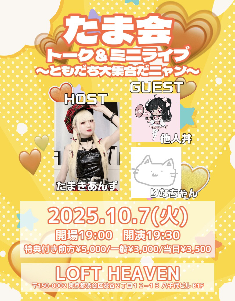 SCHEDULE 2025 10 07 Tuesday 『たま会~トーク&ミニライブ ともだち大集合だニャン~』 OPEN 19:00 - START 19:30 Tweet 【出演】 たまきあんず りなちゃん 他人丼 TICKET【会場チケット】 S/特典付き前方 ¥5,000 A/一般 ¥3,000 当日 ¥3,500 (入場時ドリンク代¥600別途必要) LivePocket 【入場順】 ①S/特典付き前方(整理番号順) ②A/一般(整理番号順) ③当日(先着順) #たまきあんず#りなちゃん#他人丼 Share