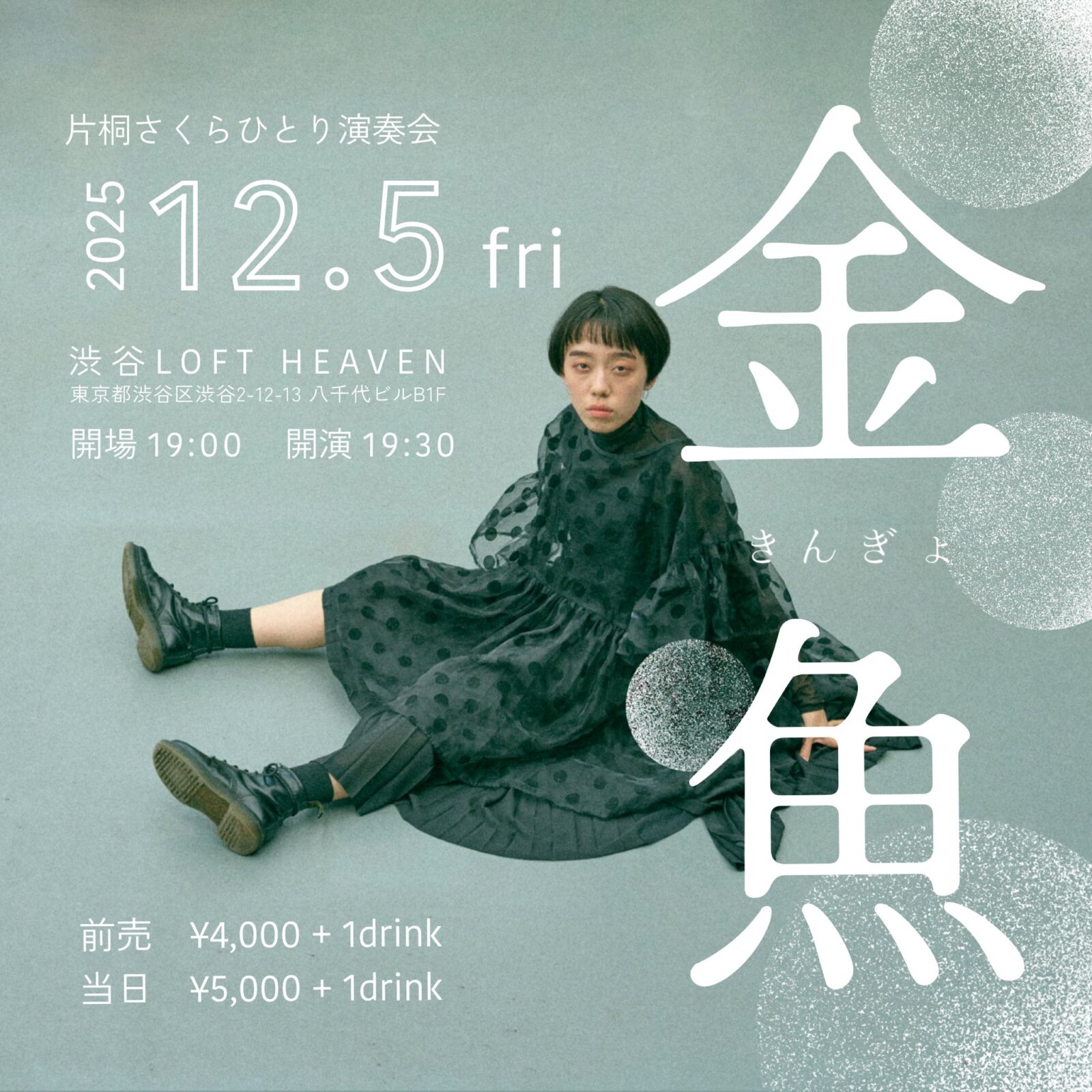 SCHEDULE 2025 12 05 Friday 片桐さくらひとり演奏会「金魚」 OPEN 19:00 - START 19:30 Tweet 【出演】 片桐さくら 【ゲスト】 古賀いずみ TICKET【料金】 前売¥4,000/当日¥5,000 ※入場時ドリンク代¥600別途必要 予約はこちらから itsumo-music.jp/s/ #片桐さくら#古賀いずみ Share