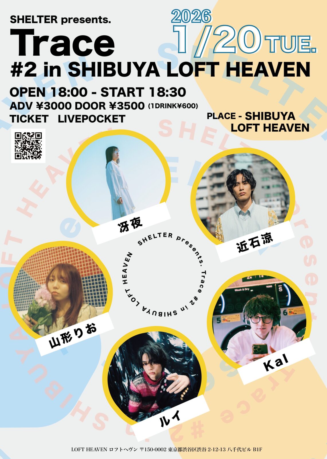SCHEDULE 2026 01 20 Tuesday SHELTER presents. Trace #2 in SHIBUYA LOFT HEAVEN OPEN 18:00 - START 18:30 Tweet 【出演】 近石涼 ルイ 山形りお 冴夜 KaI TICKET<チケット購入> 前売¥3,000/当日¥3,500 ※入場時ドリンク代¥600別途 ※椅子席(全席自由) ※整理番号順入場 https://livepocket.jp/e/20260120 販売期間:2025年11月15日(土) 12:00〜2025年12月10日(水) 23:59 #近石涼#ルイ#山形りお#冴夜#KaI Share
