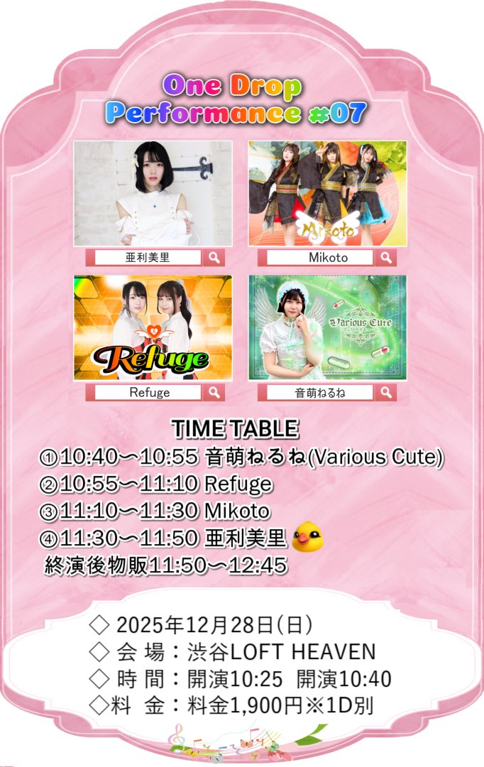 SCHEDULE 2025 12 28 Sunday DAY EVENT 【1部】OneDrop performance#07 OPEN 10:25 - START 10:40 Tweet 【出演】 亜利美里 Mikoto Refuge 音萌ねるね TICKET料金:¥1,900 ※入場時ドリンク代¥600別途必要 https://ticketdive.com/event/one2025-12-28_07 Share