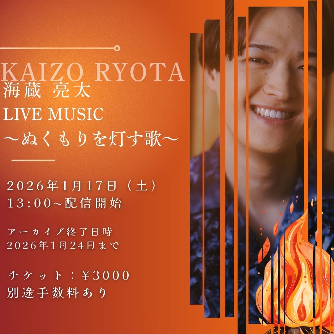 SCHEDULE 2026 01 17 Saturday 配信のみ 海蔵亮太 LIVE MUSIC~ぬくもりを灯す歌〜 START 13:00 Tweet 【出演】 海蔵亮太 TICKET【配信チケット】 料金¥3,000 https://loft-prj.zaiko.io/item/378549 アーカイブ終了日時(最大) 2026年1月24日 (土) 23:59 #海蔵亮太 Share