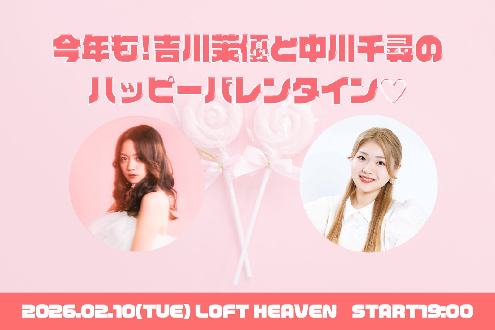 SCHEDULE 2026 02 10 Tuesday 今年も!吉川茉優と中川千尋のハッピーバレンタイン💖 OPEN 18:30 - START 19:00 Tweet 【出演】 吉川茉優 中川千尋 TICKET【チケット情報】 ・SSチケット(¥20,000) ※前方優先エリア/2人のメッセージカード付きバレンタインチョコ ・一般チケット(¥4,000) ※SSチケットの整理番号は購入順ではなくランダムで発行いたします ※それぞれ入場時ドリンク代¥600別途必要 ※全席指定公演 https://yum-e.zaiko.io/e/happyval2026 Share