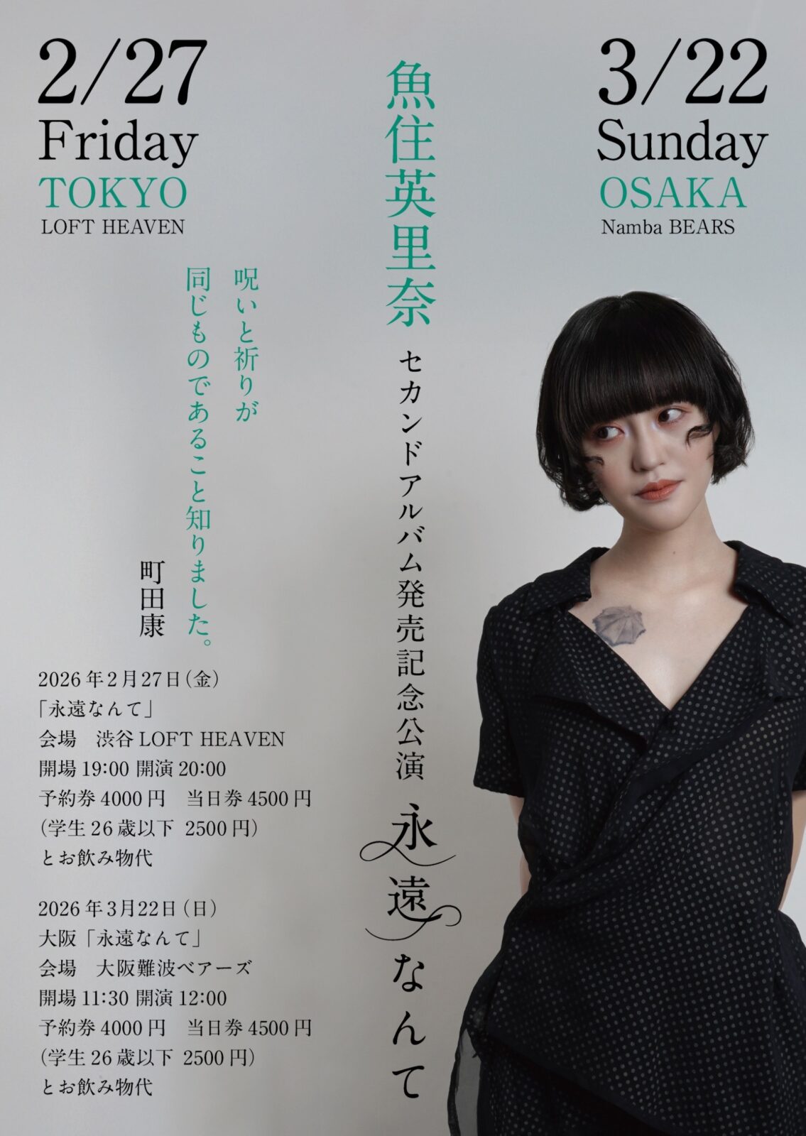 SCHEDULE 2026 02 27 Friday 魚住英里奈2ndAlbum発売記念単独公演「永遠なんて」 OPEN 19:00 - START 20:00 Tweet 【出演】 魚住英里奈 TICKET【会場チケット】 前売 ¥4,000 当日 ¥4,500 学生/26歳以下 ¥2,500 ※学生証/身分証をご持参ください (入場時ドリンク代¥600別途必要) チケット予約 erinachaschan@gmail.com 【入場順】 先着順 #魚住英里奈 Share