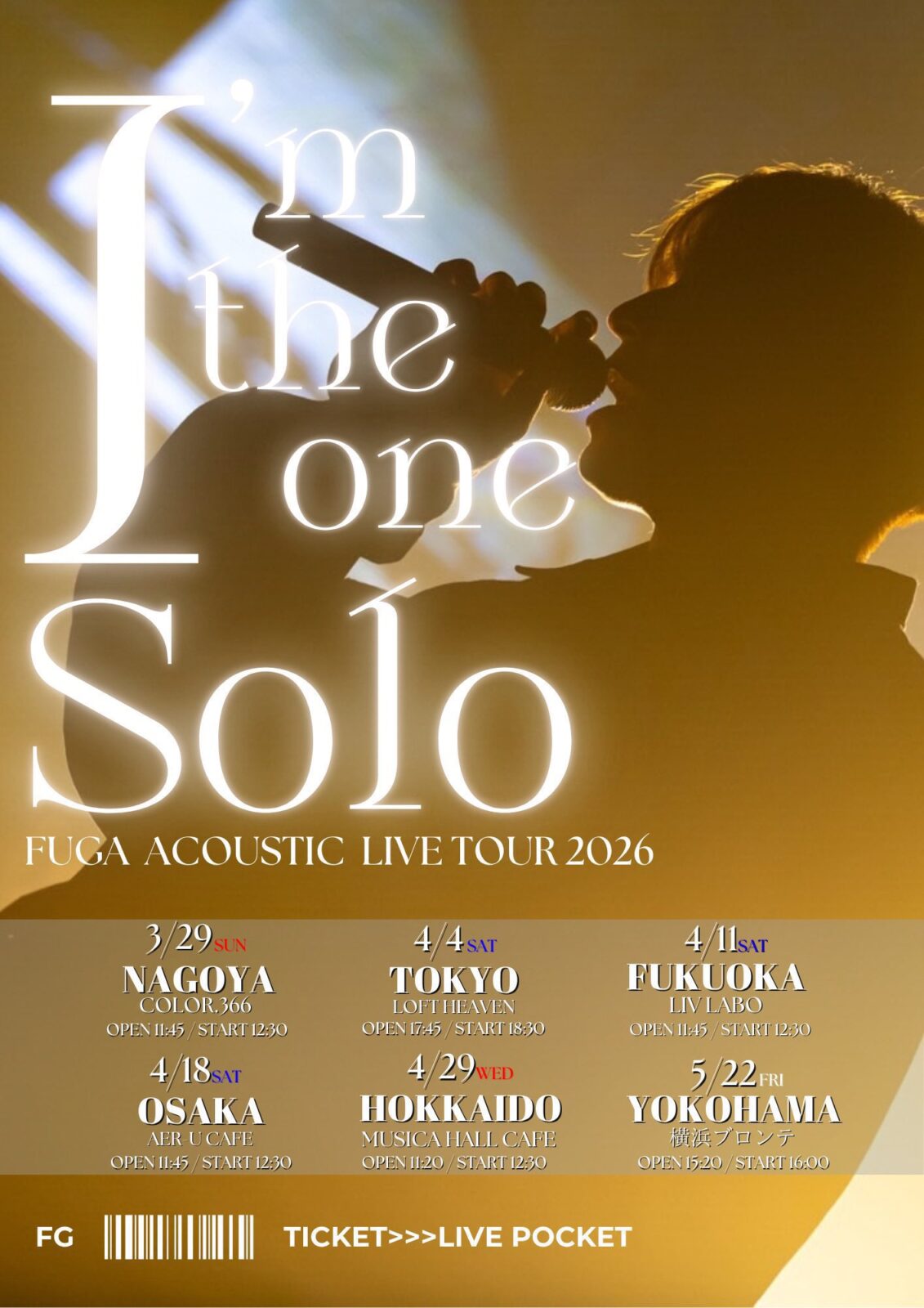SCHEDULE 2026 04 04 Saturday I’m the one Solo -FUGA ACOUSTIC LIVE TOUR 2026- OPEN 17:45 - START 18:30 Tweet 【出演】 FUGA TICKET<チケット> ・Fチケット ¥13,600 ・Uチケット ¥6,600 チケットの詳細は下記URL参照ください https://livepocket.jp/e/1djgy #FUGA Share