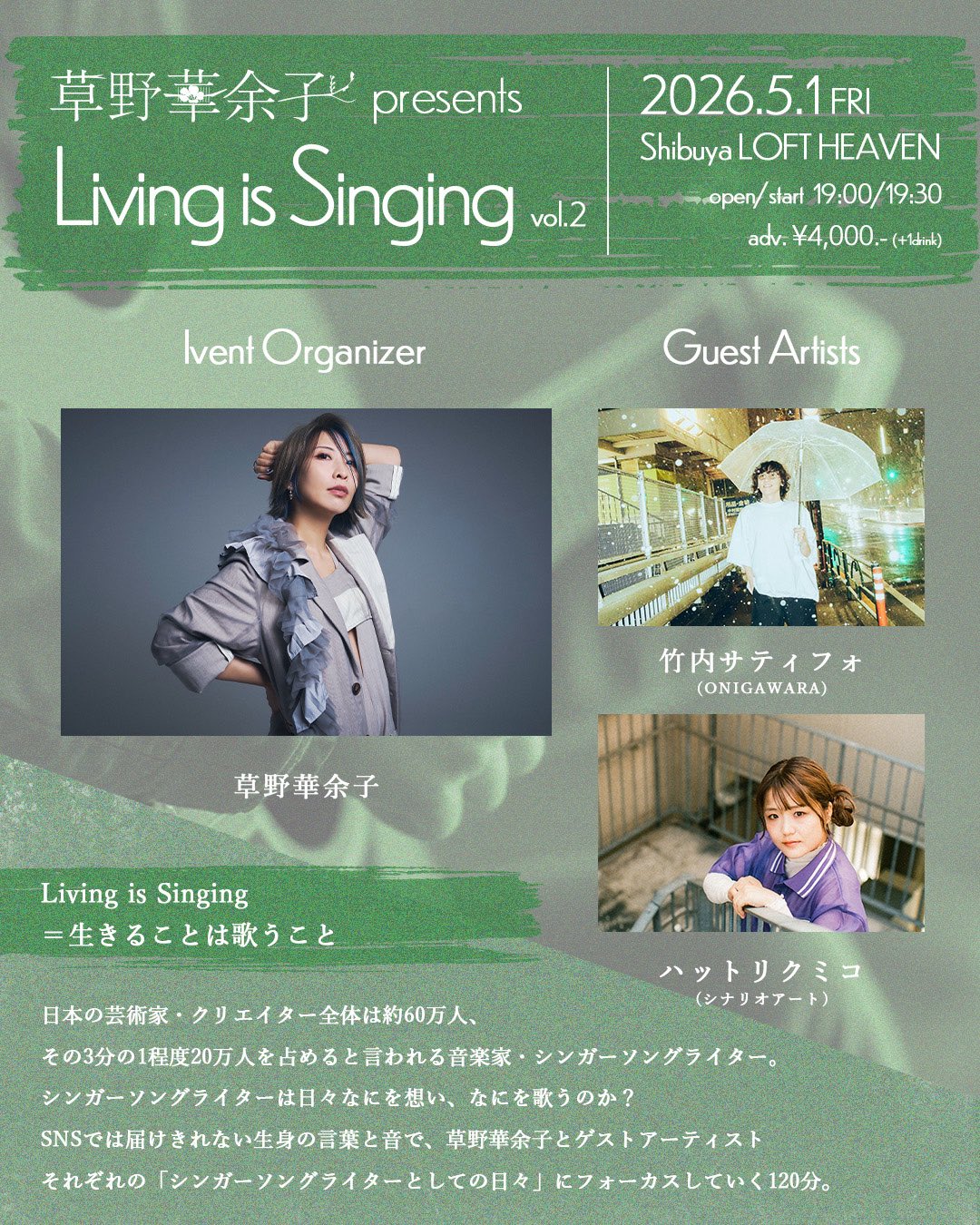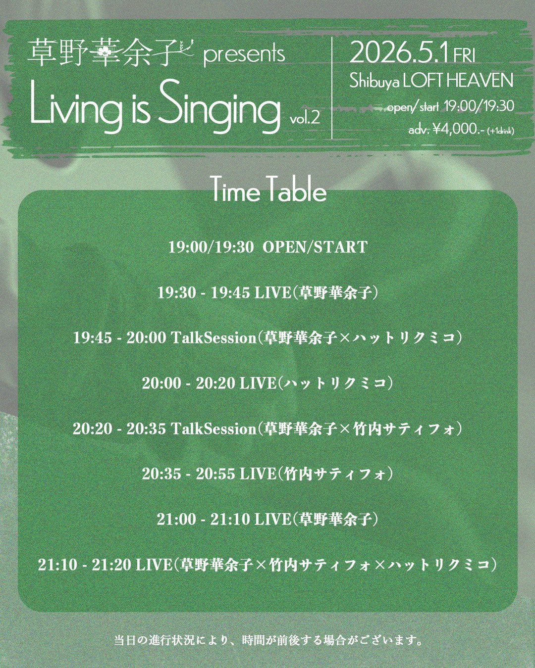 SCHEDULE 2026 05 01 Friday 草野華余子 presents 「Living is Singing」 vol.2 OPEN 19:00 - START 19:30 Tweet 【出演】 草野華余子 竹内サティフォ(ONIGAWARA) ハットリクミコ TICKET<チケット購入> 前売¥4,000/当日未定 ※入場時ドリンク代¥600別途 ※椅子席(全席自由) ※整理番号順入場 https://livepocket.jp/e/nm3mm 販売期間:2026年3月5日(木) 20:00〜2026年5月1日(金) 19:30 Share