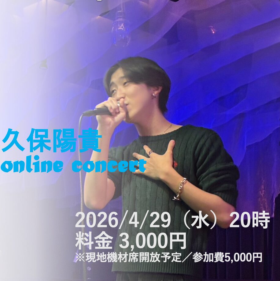 SCHEDULE 2026 04 29 Wednesday 配信のみ 久保陽貴 online concert START 20:00 Tweet 【出演】 久保陽貴 TICKET【配信チケット】 料金¥3,000 https://loft-prj.zaiko.io/item/381566 アーカイブ終了日時(最大) 2026年5月05日 (火)23:59 久保陽貴 Share