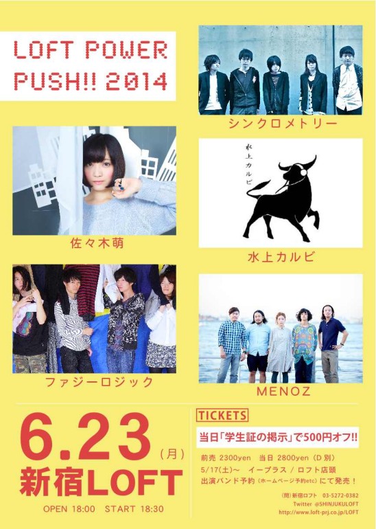 SCHEDULE 2014 06 23 Monday LOFT POWER PUSH!!2014 OPEN 18:00 - START 18:30 Tweet 佐々木萌 / シンクロメトリー 水上カルビ / ファジーロジック / MENOZ TICKETADV¥2300 / DOOR¥2800 【発売】eplus・LOFT 5/17〜 ※学生証提示で¥500オフ! SHARE