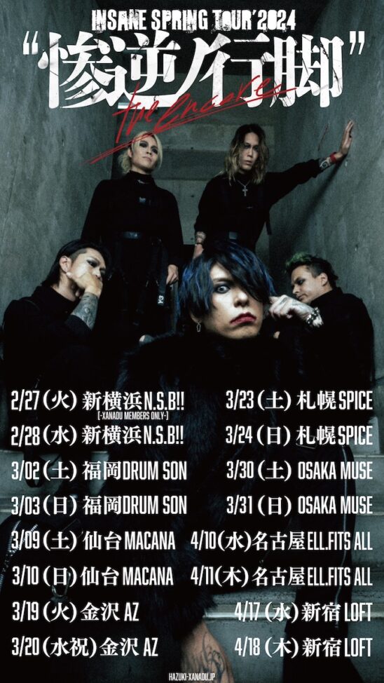 SCHEDULE 2024 04 18 Thursday INSANE SPRING TOUR’2024”惨逆ノ行脚” -the encore- OPEN 18:15 - START 19:00 Tweet HAZUKI TICKETADV¥7000 / DOOR¥未定(DRINK代別¥600) [発売]LAWSON 2月4日(日)10:00〜 ※未就学児入場不可 SHARE