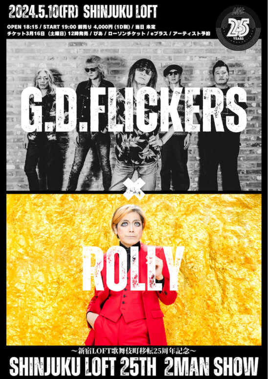 SCHEDULE 2024 05 10 Friday 〜新宿LOFT歌舞伎町移転25周年記念〜 『SHINJUKU LOFT 25TH 2MAN SHOW』 OPEN 18:15 - START 19:00 Tweet G.D.FLICKERS / ROLLY TICKETADV¥4000 / DOOR¥未定(DRINK代別¥600)[発売]PIA・LAWSON・eplus 3月16日(土)12:00〜●Pコード:264-954 / Lコード:75803 ※入場順:①プレイガイドチケット並列入場 ②アーティスト予約 ③当日券 SHARE