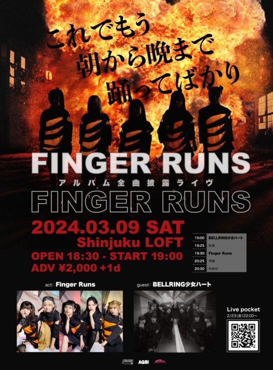 SCHEDULE 2024 03 09 Saturday アルバム全曲披露ライヴ「Finger Runs」 OPEN 18:30 - START 19:00 Tweet Finger Runs ゲスト:BELLRING少女ハート TICKETADV¥2000 / DOOR¥未定(DRINK代別¥600) [発売]Live Pocket 2月23日(金)22:00〜3月8日(金)22:00まで https://t.livepocket.jp/e/v5hc0 ※先着クレカ、コンビニ、その他決済可 ※おひとり様2枚まで(複数回申し込み可) ※チケット番号順入場 SHARE