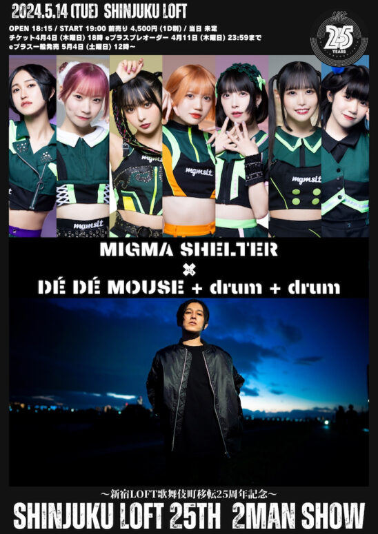 SCHEDULE 2024 05 14 Tuesday 〜新宿LOFT歌舞伎町移転25周年記念〜 『SHINJUKU LOFT 25TH 2MAN SHOW』 OPEN 18:15 - START 19:00 Tweet MIGMA SHELTER DÉ DÉ MOUSE + drum + drum TICKETADV¥4500 / DOOR¥未定(DRINK代別¥600) [発売] eplusプレオーダー 4月4日(木)18:00〜4月11日(木)23:59まで eplus一般 5月4日(土)12:00〜 SHARE