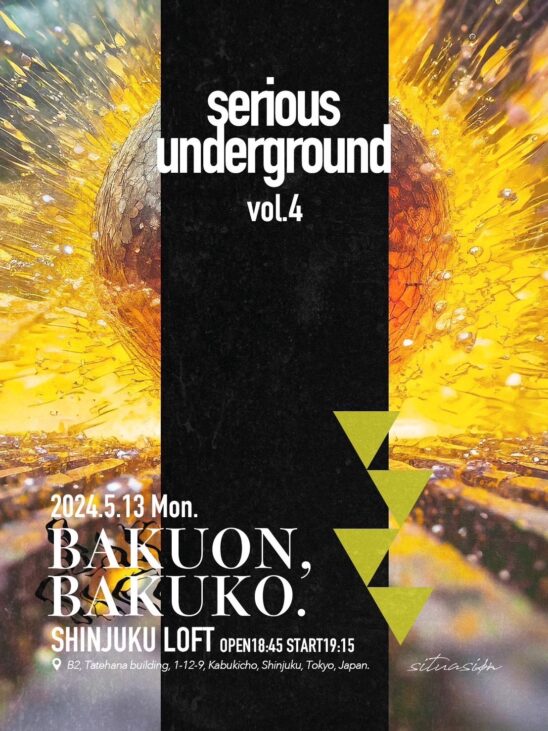SCHEDULE 2024 05 13 Monday serious underground vol.4 OPEN 18:45 - START 19:15 Tweet situasion TICKETADV¥2500 / DOOR¥未定(DRINK代別¥600) [発売]Live Pocket 4月23日(火)21:00〜5月12日(日)22:00まで https://t.livepocket.jp/e/7zazj ※先着クレカ、コンビニ、その他決済可 ※おひとり様2枚まで(複数回申し込み可) ※チケット番号順入場 SHARE
