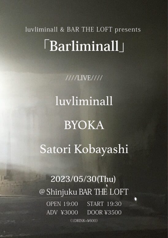 SCHEDULE 2024 05 30 Thursday 【BAR LOUNGE】 luvliminall&BAR THE LOFT presents – Barliminall – OPEN 19:00 - START 19:30 Tweet luvliminall / BYOKA / Satori Kobayashi (全3組出演) TICKETADV¥3000 / DOOR¥3500(DRINK代別¥600) [発売]出演者予約のみ SHARE