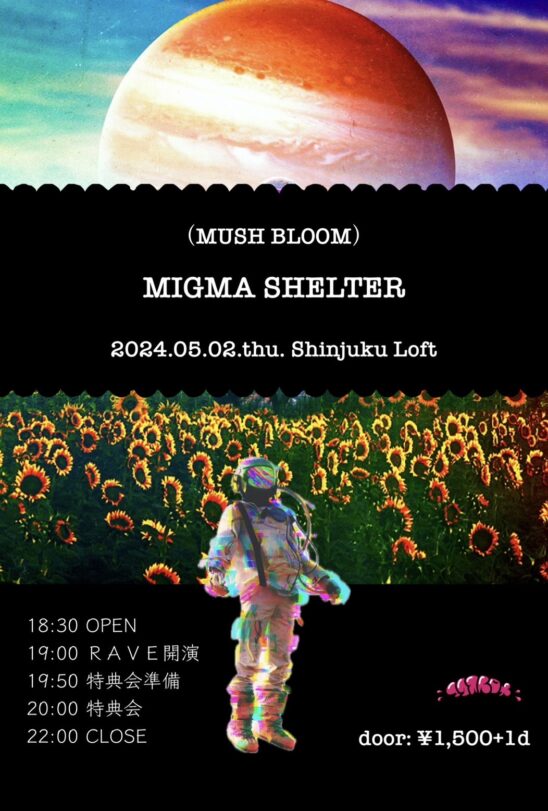 SCHEDULE 2024 05 02 Thursday MIGMA SHELTER 単独公演 OPEN 18:30 - START 19:00 Tweet MIGMA SHELTER TICKET当日券のみ 1500円 (1D別) 本公演は当日券のみとなります。 入場順は来た順となりますのでご了承下さい SHARE