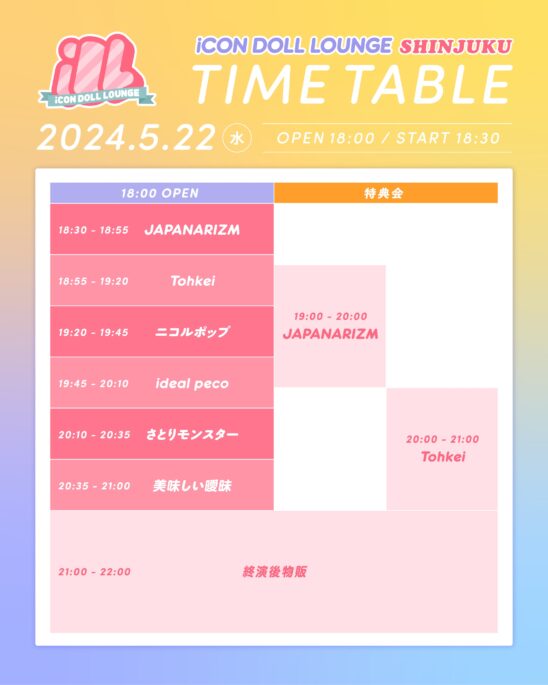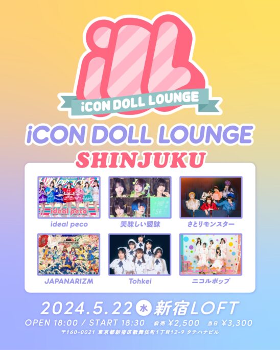 SCHEDULE 2024 05 22 Wednesday 『iCON DOLL LOUNGE 』 -SHINJUKU – OPEN 18:00 - START 18:30 Tweet ideal peco 美味しい曖昧 さとりモンスター JAPANARIZM Tohkei ニコルポップ TICKETADV¥2500 / DOOR¥3000(DRINK代別¥600) [発売]Live pocket 5月15日(水)18:00〜 SHARE