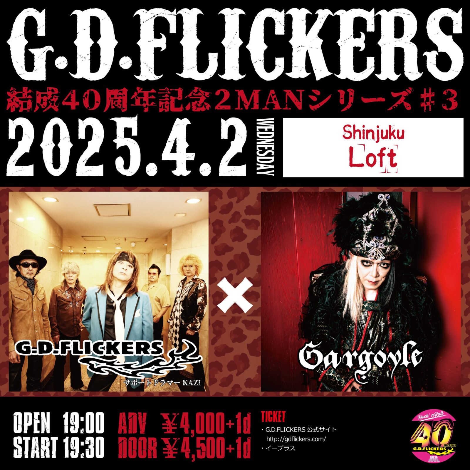 SCHEDULE 2025 04 02 Wednesday G.D.FLICKERS 結成40周年記念2MAN シリーズ♯3 OPEN 19:00 - START 19:30 Tweet G.D.FLICKERS (サポートドラマーKAZI) Gargoyle TICKETADV¥4000 / DOOR¥4500(DRINK代別¥600) [発売] eplus 1月18日(土)12:00〜 #G.D.FLICKERS (サポートドラマーKAZI)#Gargoyle SHARE