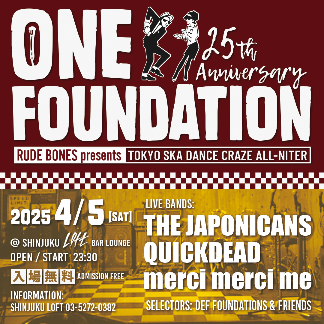 SCHEDULE 2025 04 05 Saturday MIDNIGHT EVENT BAR ONE FOUNDATION OPEN 23:30 - START 23:30 Tweet 【BAND】 THE JAPONICANS QUICKDEAD merci merci me 【DJ】 DEF FOUNDATION TICKET前売なし、入場無料 #THE JAPONICANS#QUICKDEAD#merci merci me#[DJ] DEF FOUNDATION SHARE