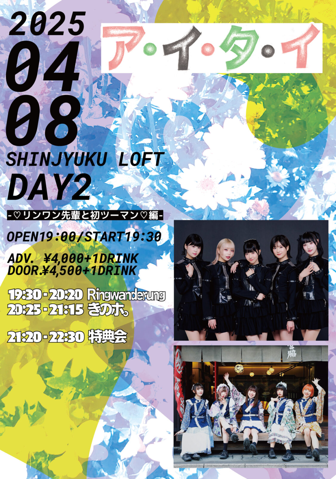 SCHEDULE 2025 04 08 Tuesday 『ア・イ・タ・イ』DAY 2 ~♡リンワン先輩と初ツーマン♡編~ OPEN 19:00 - START 19:30 Tweet Ringwanderung きのホ。 TICKETADV¥4000 / DOOR¥4500(DRINK代別¥600) [発売] LivePocketにて発売中 https://t.livepocket.jp/e/xy0pa #Ringwanderung#きのホ。 SHARE