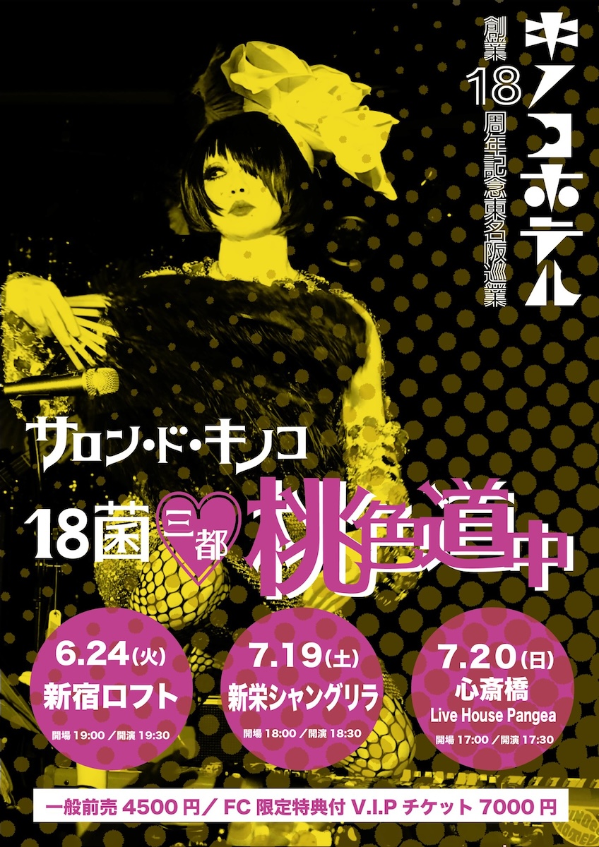 SCHEDULE 2025 06 24 Tuesday キノコホテル創業18周年記念東名阪巡業 サロン・ド・キノコ~18菌♡三都桃色道中 東京編 OPEN 19:00 - START 19:30 Tweet キノコホテル TICKETADV¥4500 / DOOR 未定(DRINK代別¥600) [発売] eplus 4月20日(日)10:00〜 ※別途FC先行(V.I.Pチケット販売)あり!詳しくは↓ https://salon-benitengu-kinocohotel.bitfan.id/ 【入場順】1V.I.Pチケット 2イープラス一般 #キノコホテル SHARE