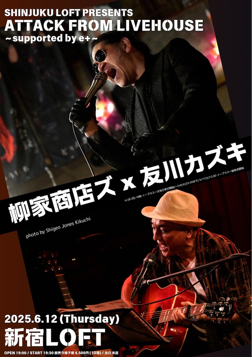 SCHEDULE 2025 06 12 Thursday SHINJUKU LOFT PRESENTS 『ATTACK FROM LIVEHOUSE』supported by e+ OPEN 19:00 - START 19:30 Tweet 柳家商店ズ 友川カズキ TICKETADV¥4500 / DOOR 未定(DRINK代別¥600) [発売] eplusプレオーダー 4月28日(月)18:00〜5月6日(火・祝)23:59まで eplus一般 5月17日(土)12:00〜 https://eplus.jp/attackfromlivehouse/ #柳家商店ズ#友川カズキ SHARE