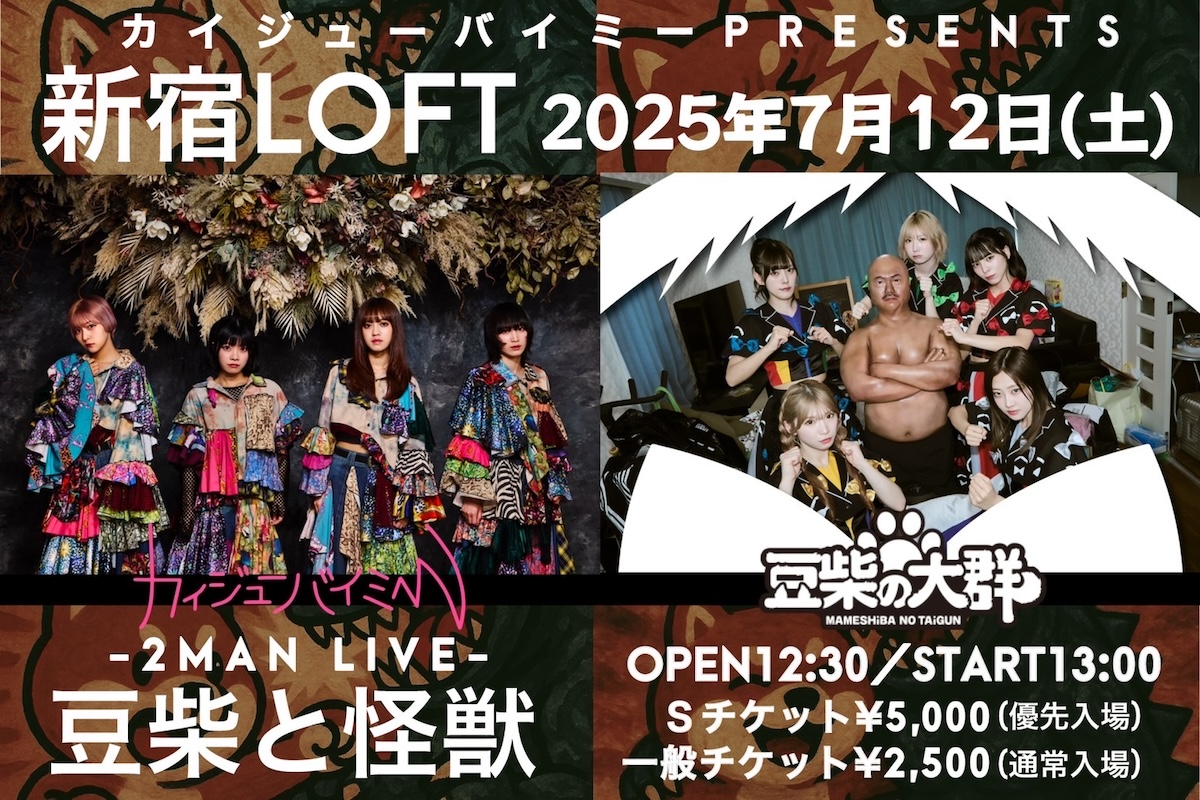 SCHEDULE 2025 07 12 Saturday DAY EVENT カイジューバイミーPRESENTS 2MAN LIVE「豆柴と怪獣」 OPEN 12:30 - START 13:00 Tweet 豆柴の大群 カイジューバイミー TICKETADV:Sチケット¥5000・一般チケット¥2500 DOOR:未定 (各DRINK代別¥600) [発売] LivePocket(先着) ◼︎Sチケット 6月9日(月)21:30〜7月11日(金)23:59まで ◼︎一般チケット 6月9日(月)22:00〜7月11日(金)23:59まで 【入場順】①Sチケット ②一般チケット ③当日券 #豆柴の大群#カイジューバイミー SHARE