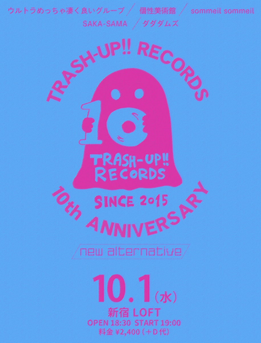 SCHEDULE 2025 10 01 Wednesday TRASH-UP!!RECORDS 10周年記念イベント vol.4 OPEN 18:30 - START 19:00 Tweet ウルトラめっちゃ凄く良いグループ 個性美術館 SAKA-SAMA ダダダムズ TICKETADV¥2400 / DOOR 未定(DRINK代別¥600) [発売] TIGETにて予約受付中 https://tiget.net/events/430460 #ウルトラめっちゃ凄く良いグループ#個性美術館#SAKA-SAMA#ダダダムズ SHARE