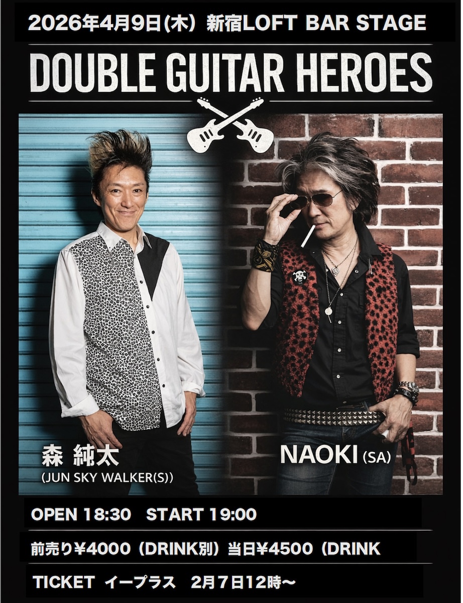 SCHEDULE 2026 04 09 Thursday BAR “DOUBLE GUITAR HEROES“ OPEN 18:30 - START 19:00 Tweet 森 純太(JUN SKY WALKER(S)) NAOKI(SA) TICKETADV¥4000 / DOOR¥4500(DRINK代別¥600) [発売] eplus 2月7日(土)12:00〜 #森 純太(JUN SKY WALKER(S))#NAOKI(SA) SHARE