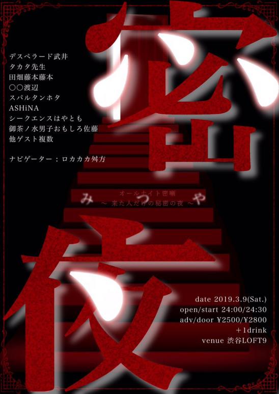 世間を騒がした大事件の裏側や都市伝説、心霊現象やゴシップに至るまで、都市伝説好きな芸人たちが集まり、ここだけでしか聞けない話【密噺】を披露していくオールナイトトークライブ。様々なジャンルに特化したトークを持つ芸人たちが多数登場!