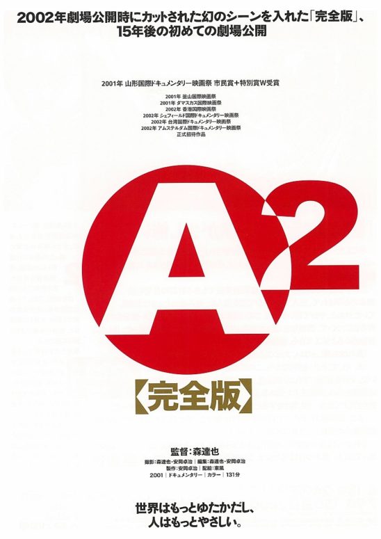 (2015/日本/制作:安岡卓治/監督:森達也/撮影・編集:森達也、安岡卓治/配給東風/131分)オウム事件の本質に迫った『A』(1998)の第2作として2002年公開の『A2』。劇場公開時にカットされた幻のシーンを入れた「完全版」として、2016年にユーロスペースで初めて劇場公開された。本作品はDVDなど市販されていない。