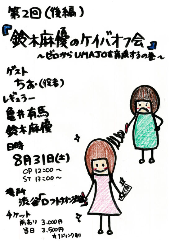SCHEDULE 2019 08 31 Saturday DAY EVENT 第二回(後編) 鈴木麻優のケイバオフ会 ~ゼロからUMAJOを育成するの巻~ OPEN 12:00 - START 13:00 Tweet 【ゲスト】 ちお(役者) 【レギュラー】 亀井有馬 鈴木麻優 TICKET前売 ¥3,000 / 当日 ¥3,500(要別途飲食代) 当日券あり!開場後の販売となります。 前売はイープラスにて8/1(木)正午より発売開始! ※フラワースタンドの設置はできません。お花をお贈り頂く場合は卓上サイズのアレンジメントをご利用ください。 Share