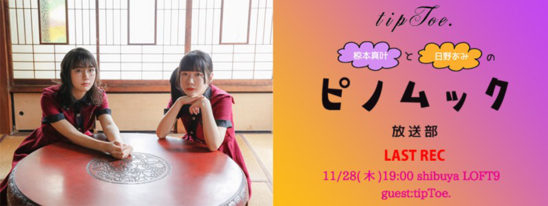 2018年9月から続けてきた「ピノムック放送部」も今回で最終回。最後のゲストはtipToe.のメンバー!第一期終了を前にあらためてこれまでの活動や、ステージやそれ以外での成長、ラストライブに向けてへの思いなどを、2人がこれまで数々のゲスト相手に鍛え上げた?トークで切り込みます!