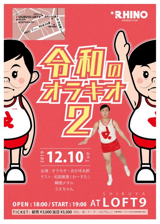 SCHEDULE 2019 12 10 Tuesday 令和のオラキオ2 OPEN 18:00 - START 19:00 Tweet 【出演】オラキオ、おかゆ太郎(ロボットまんぞうさん) 【ゲスト】松田美里(わーすた)、瞬間メタル、うえちゃん TICKET前売¥3,000 / 当日3,500(飲食代別・要1ドリンク以上オーダー) 前売はe+にて11/23(土)正午より発売 ※フラワースタンドの設置はできません。お花をお贈り頂く場合は卓上サイズのアレンジメントをご利用ください。 Share