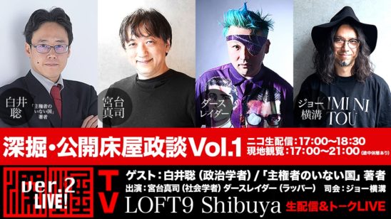 白井聡+宮台真司、ダースレイダーのレギュラー陣による『深掘・公開床屋政談Vol.1』。