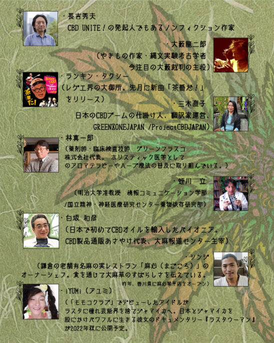 CBD UNITE!の発起人でもあるノンフィクション作家の長吉秀夫氏が「ユナイトしちゃおうぜぇ!」と、その道のプロの方々をお招きして、カンナビノイド業界の現在とその先に繋がるサイケデリクス業界の未来を「ハーブ(植物)」を通じて、科学的に、そして、非科学的に語り合う、まさにサイケデリクスなトークセッションです。