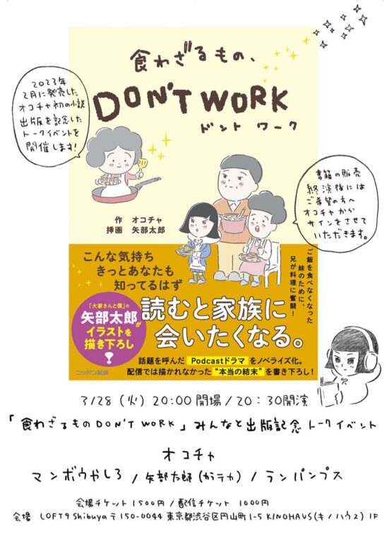2023年2月に発売した 作/オコチャ挿画/矢部太郎(カラテカ) 『食わざるもの、DON’T WORK』オコチャ初の小説出版を記念してトークイベントを開催します。