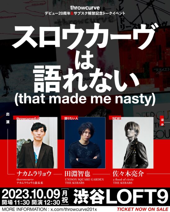 メンバーのナカムラリョウ(Vo&Gt)他、自身の楽曲『スロウカーヴは打てない(that made me crazy)』でもオマージュを捧げるなどthrowcurveからの影響を公言しているUNISON SQUARE GARDENの田淵智也らが、バンドの歴史や知られざるエピソード、そして“あの頃の下北沢”を振り返り、語り尽くす。