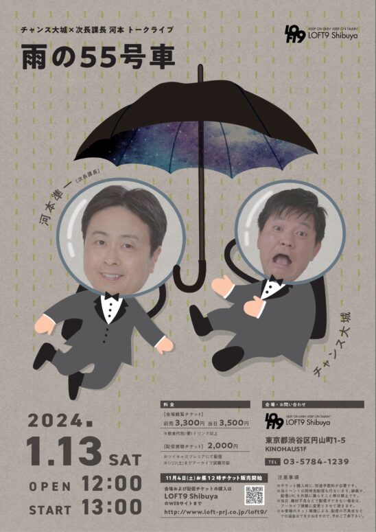 SCHEDULE 2024 01 13 Saturday DAY EVENT チャンス大城×次長課長 河本トークライブ 『雨の55号車』 OPEN 12:00 - START 13:00 Tweet 【出演】チャンス大城、河本準一(次長課長) TICKET会場チケット 前売¥3,300 / 当日¥3,500(※飲食代別・要1ドリンク以上) 前売はLivePocketにて11/4(土)正午より発売 ご購入はこちらから 配信視聴チケット ¥2,000 配信視聴チケットはキャスマーケットにて発売中 アーカイブは1/27(土)まで視聴可能 ご購入はこちらから ※フラワースタンドの設置はできません。お花をお贈り頂く場合は卓上サイズのアレンジメントをご利用ください。 Share