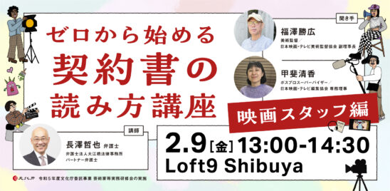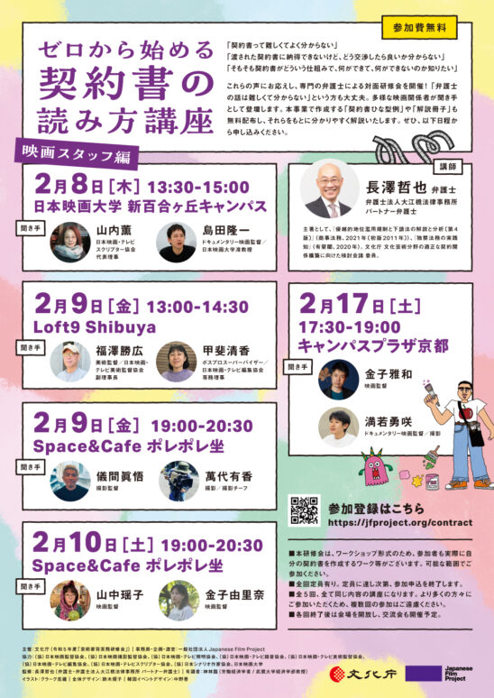 これらの声にお応えし、専門の弁護士による対面研修会を開催!「弁護士の話は難しくて分からない」という方も大丈夫。多様な映画関係者が聞き手として登壇します。本事業で作成する「契約書ひな型」や「解説冊子」も無料配布し、それらをもとに分かりやすく解説いたします。ぜひ、以下日程から申し込みください。