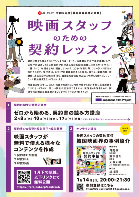 契約に関する様々なコンテンツを作成しました。本事業は文化庁委託事業として、文化庁が公表した「文化芸術分野の適正な契約関係構築に向けたガイドライン」に基づいて、有識者と共に制作しています。2024年秋以降、フリーランス新法が施行されます。発注者は、スタッフに業務委託をした場合、直ちに、業務内容、報酬額、支払期日その他の事項を、書面または電磁的方法で明示しなければ、フリーランス新法違反となってしまいます。