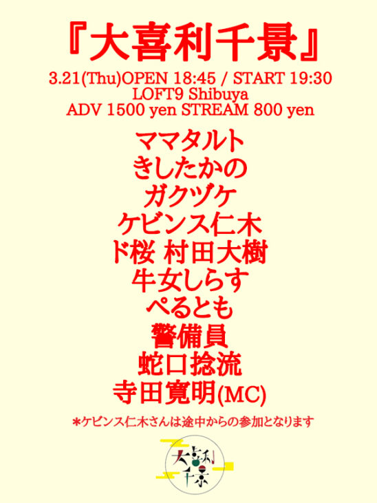 【出演】ママタルト、きしたかの、ガクヅケ、ケビンス仁木、ド桜 村田大樹、牛女しらす、ぺるとも、警備員、蛇口捻流、寺田寛明(MC)