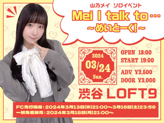 SCHEDULE 2024 03 24 Sunday Mei I talk to… ~めいとーく!~ OPEN 18:00 - START 19:00 Tweet 【出演】山乃メイ TICKET前売¥2,500 / 当日¥3,000(共に飲食代別) 先行抽選 3/13(水)21:00-3/16(土) 23:59迄 一般販売 3月18日(月)21:00販売開始 ※先着 一般販売チケット購入はこちらから! ※フラワースタンドの設置はできません。お花をお贈り頂く場合は卓上サイズのアレンジメントをご利用ください。 Share