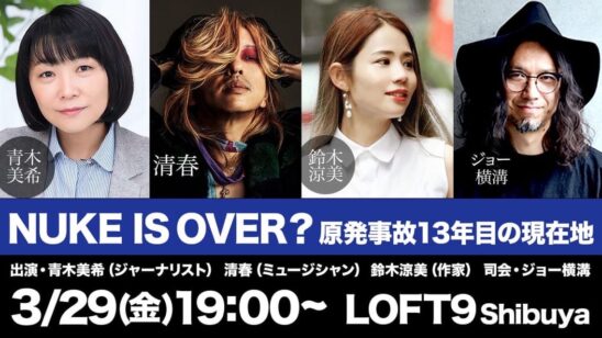 出演は話題の『なぜ日本は原発を止められないのか?』(文春新書)の著者で原発取材を続けるジャーナリスト・青木美希。原発関連トークイベントには初出演となる清春。そして作家の鈴木涼美。