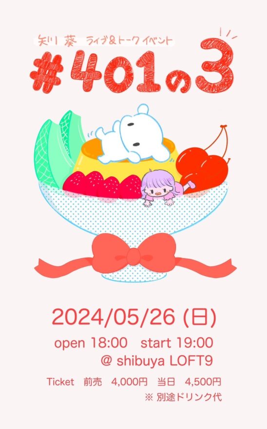 SCHEDULE 2024 05 26 Sunday 矢川葵トーク&ライブイベント「#401の3」 OPEN 18:00 - START 19:00 Tweet 【出演】矢川葵 @aoiygw TICKET会場チケット前売¥4,000 / 当日¥4,500(飲食代別・要1オーダー) 会場チケット前売はLivePocketにて5/10(金)20時より発売 ご購入はコチラから ※フラワースタンドの設置はできません。お花をお贈り頂く場合は卓上サイズのアレンジメントをご利用ください。 Share