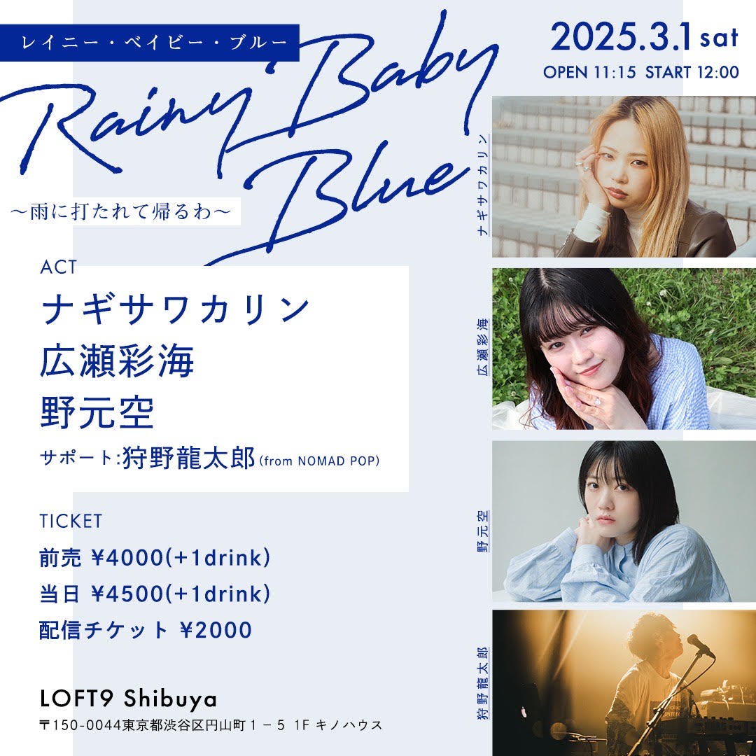 惜しまれて終わってしまった、シンガソングライター、ナギサワカリンが主催する広瀬彩海と野元空とのスリーマンライブ『Rainy Baby Blue〜雨に打たれて帰ってくるわ〜』がついにLOFT9に帰ってきた!今回も歌声抜群の三人が繰り広げるライブにトーク、コラボだけではなくなんと、今回は三人があるコーナーにも挑戦!盛り沢山でお送り致します。演奏サポートには「かのせんせー」ことNOMAD POPから狩野龍太郎も参加!