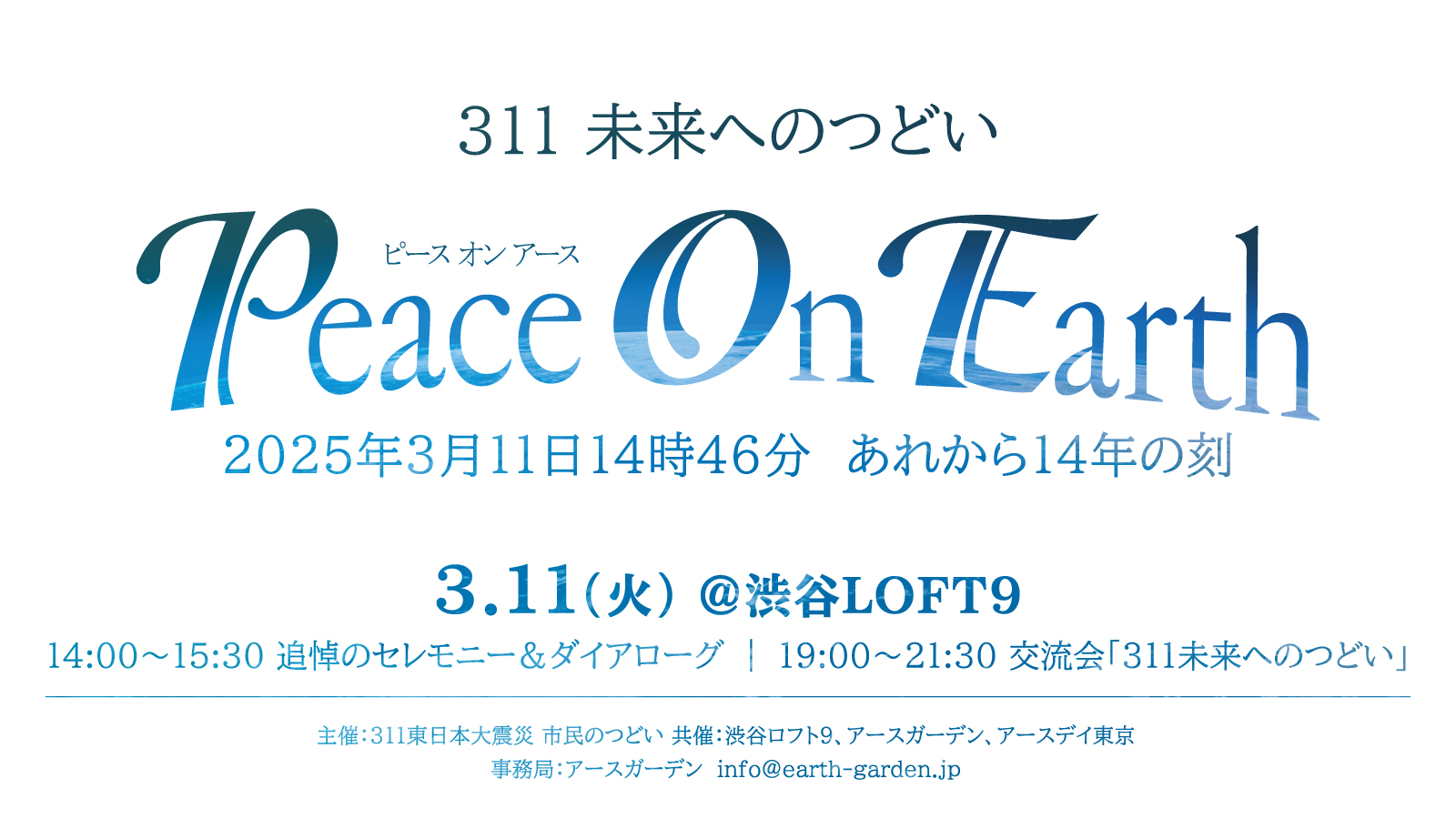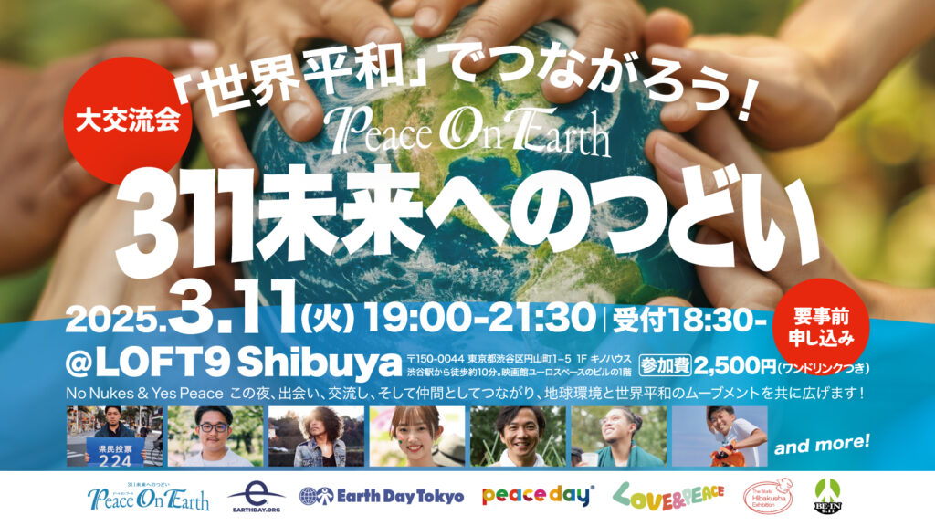 311から未来へ!!!今回の交流イベントでは「世界平和」を基調としながら、アースデイ向けて取り組む様々なテーマについてそれぞれ分野で活動するゲストを招き、多様な視点から、改めて、それぞれの分野における「平和とは何か?」について問います。