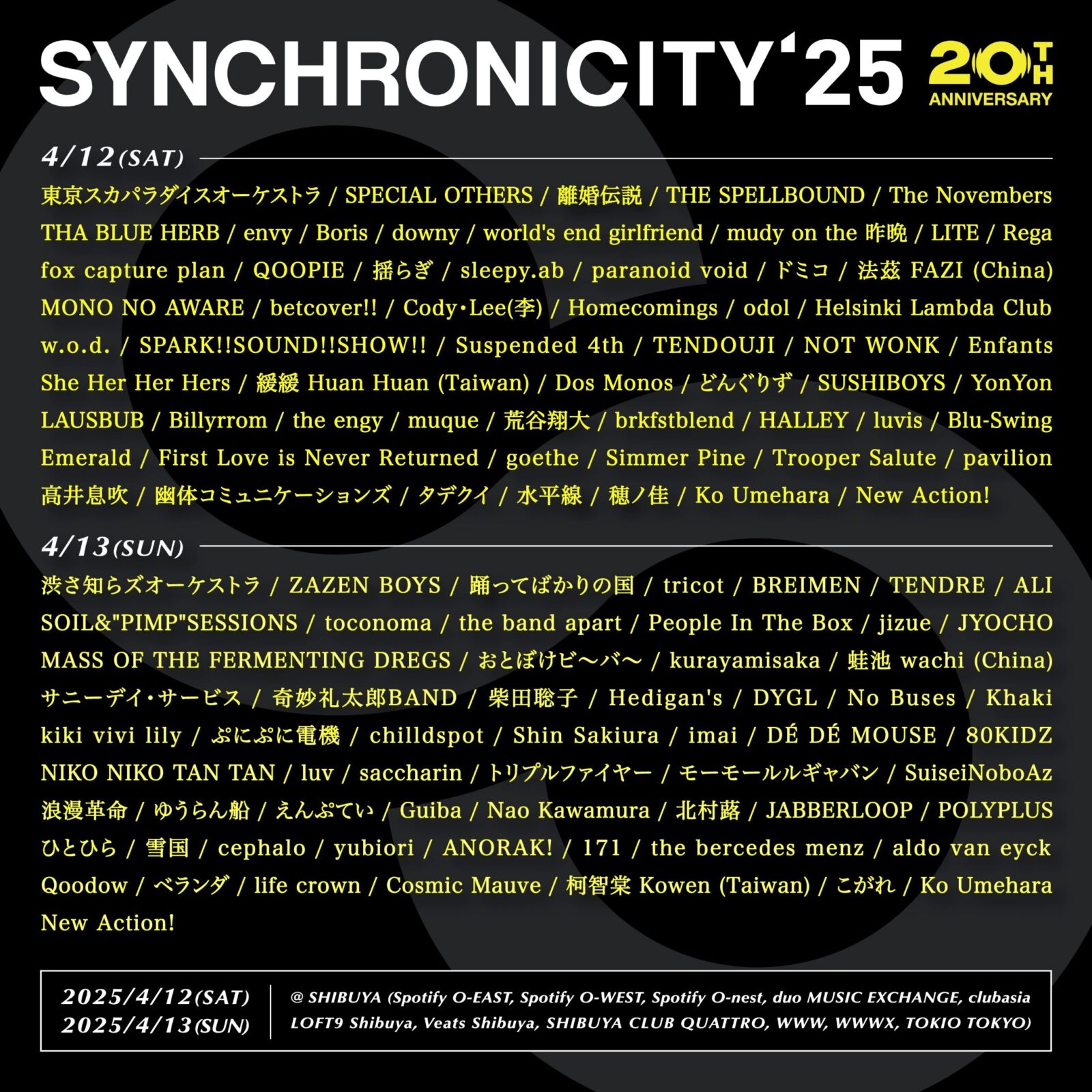 SCHEDULE 2025 04 13 Sunday SYNCHRONICITY’25 – 20th Anniversary!! – OPEN 11:00 - Tweet TICKEThttps://synchronicity.tv/festival ※フラワースタンドの設置はできません。お花をお贈り頂く場合は卓上サイズのアレンジメントをご利用ください。 Share