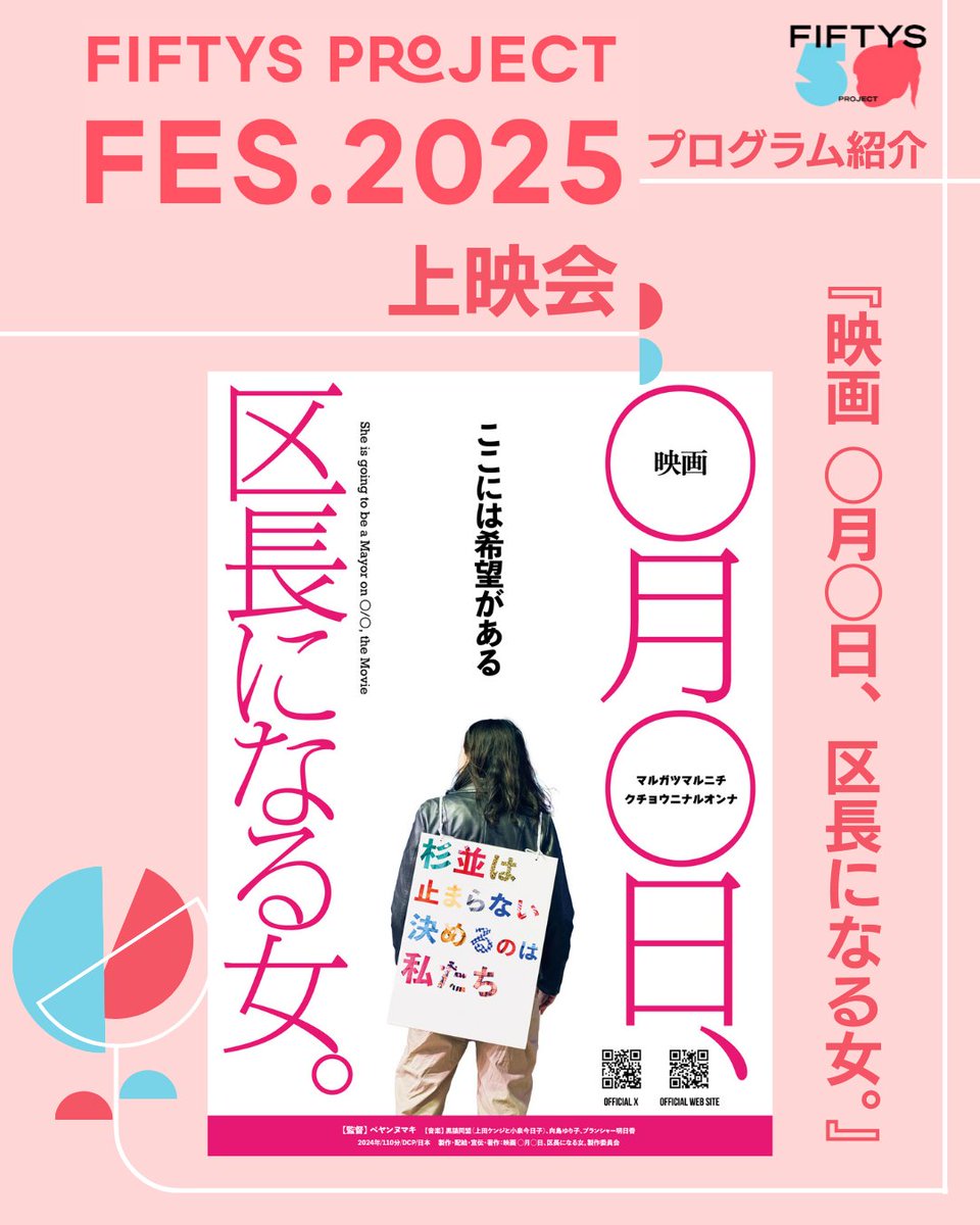 第一部で『映画 ◯月◯日、区長になる女。』の上映会を行ったのち、第二部では、杉並区長の岸本聡子さんをゲストに迎え、代表の能條桃子とのトークイベントを開催します。また、2年前の統一地方選挙ではじめて地方議員となったFIFTYS PROJECT所属議員が、この2年間の議員としての活動や思いについてシェアするリレースピーチも予定しています。