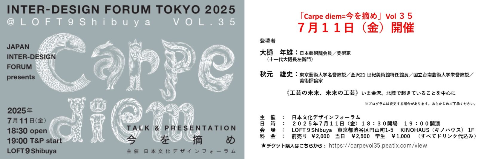 SCHEDULE 2025 07 11 Friday INTER-DESIGN FORUM TOKYO 2025 vol.35 OPEN 18:30 - START 19:00 Tweet 主催:一般社団法人日本文化デザインフォーラム(JIDF) TICKET詳細はこちらから #大樋年雄#秋元雄史 ※フラワースタンドの設置はできません。お花をお贈り頂く場合は卓上サイズのアレンジメントをご利用ください。 Share