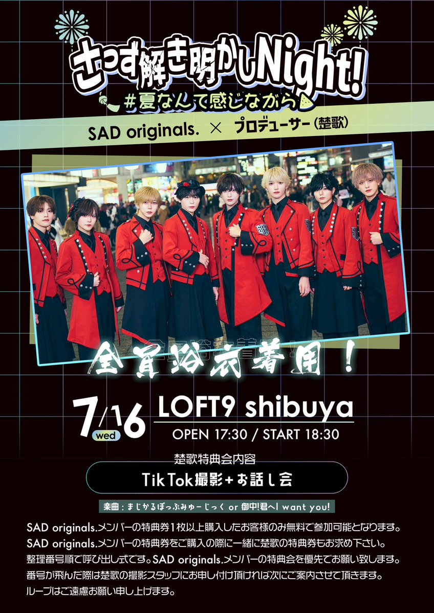 SCHEDULE 2025 07 16 Wednesday 『さっず解き明かしNight!〜#夏なんて感じながら〜』 OPEN 17:30 - START 18:30 Tweet TICKETチケット詳細はこちらから #SAD originals. ※フラワースタンドの設置はできません。お花をお贈り頂く場合は卓上サイズのアレンジメントをご利用ください。 Share